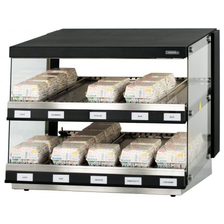 - Gehäuse schwarz lackiertes Metall, Seiten aus Glas- Ablagen in Edelstahl mit Neigung zum einfacheren nachfüllen und entnehmen - Ablagefront mit Kennzeichnungsschiene- Breite der jeweiligen Sektoren adaptierbar- Warmhaltefunktion durch UV-Leuchten- Temperatur stufenlos regelbar von 30°C bis 90°C- Leistung : 1,16 kW / 230 V - Abmessungen : L 800 x T 640 x H 685 mm - Gewicht : 41 Kg